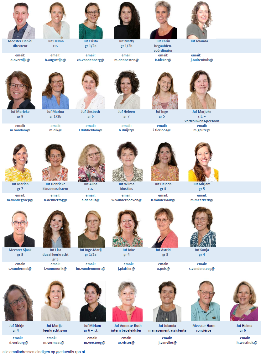 Hieronder ziet u al het personeel met hun emailadressen. Alle emailadressen eindigen op @educatis-rpo.nl